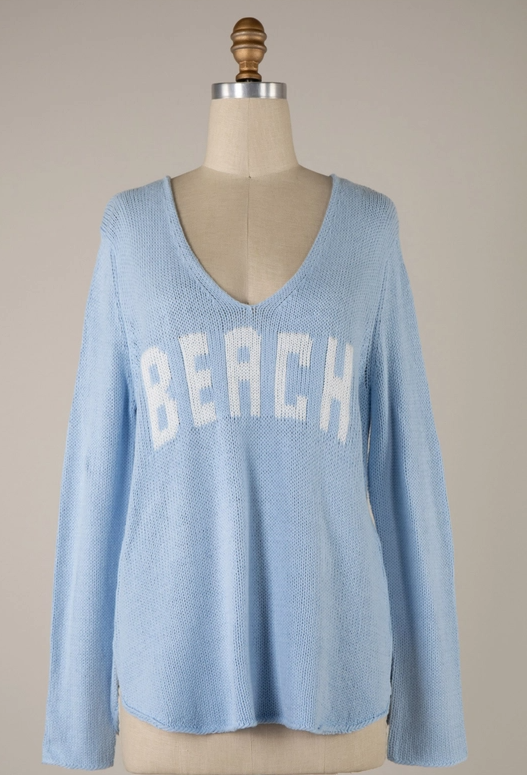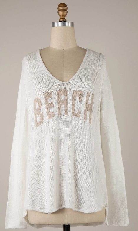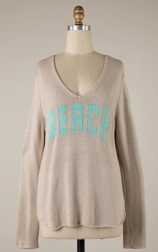 Casual coastal sweater with everyone's favorite "Beach" on the front