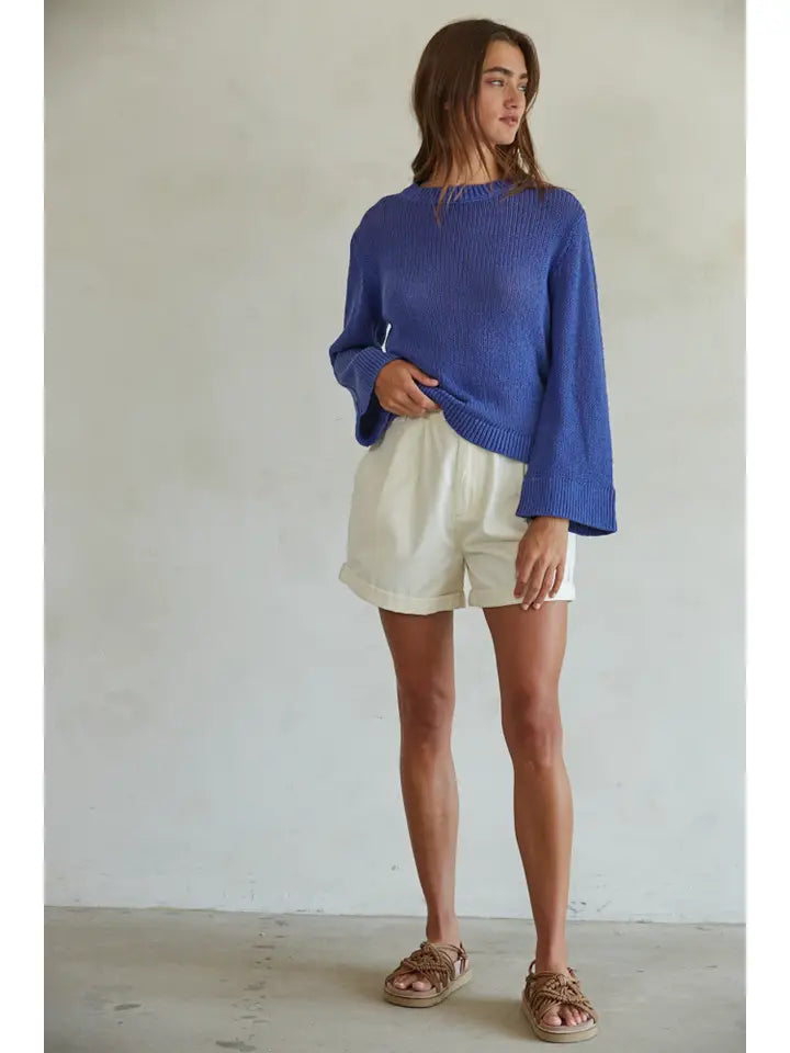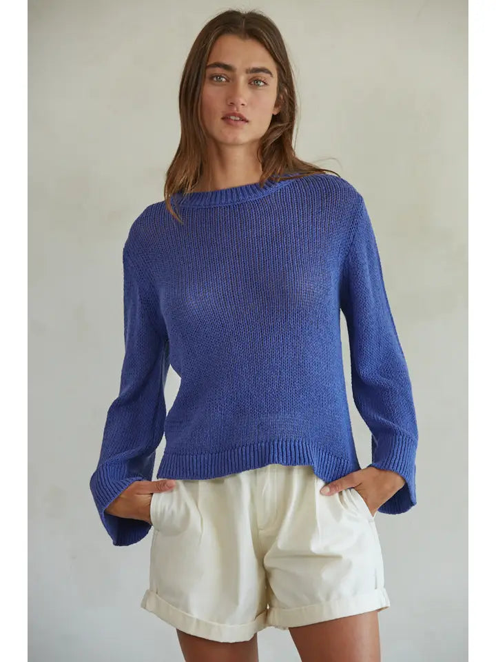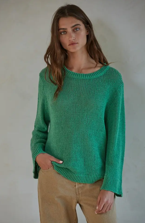 This gorgeous green sweater is loose and soft and just the absolute best piece to take you from summer to fall in style. the sleeve feature is the highlight... a loose flare makes this a stand out.