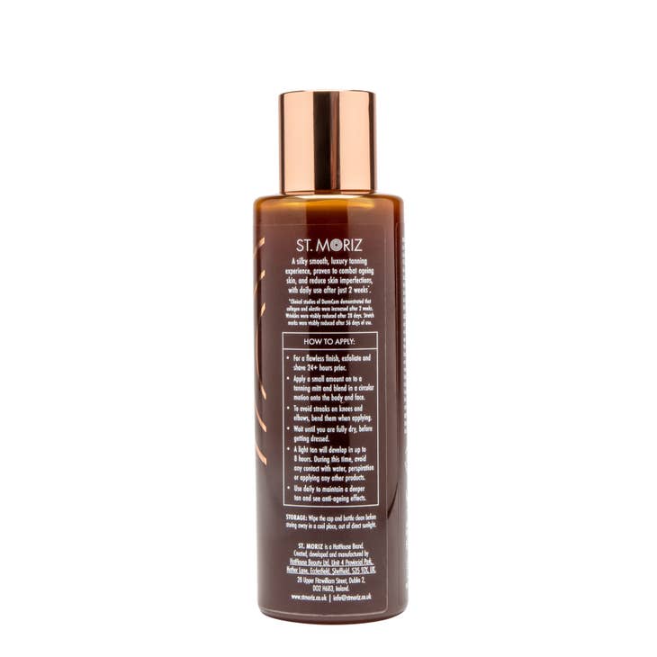 St. Moritz Advanced Pro Miracle Tanning Serum 5.07 fl OZ St. Moriz Miracle Tanning Serum is here to help you feel more confident, giving you a streak-free tan that’s packed with collagen boosting ingredients, proven to reduce the effects of aging skin and reduce skin imperfections. If that wasn’t enough, daily use visibly reduces stretch marks and wrinkles, and firms your skin after just 2 weeks*. The silky, lightweight serum glides on smoothly with an instant light glow, which gradually builds and maintains a flawless bronzed tan! With added hydration to leave both your face and body silky smooth, it’s a must-have miracle in a bottle.
