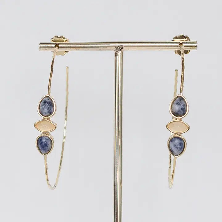 Experience the blend of old and new with Leslie Curtis Jewelry Designs. Our Suede - Gold hammered hoop with blue stones 2.5" embodies this aesthetic. Meticulously handcrafted, these earrings feature an elegant gold hammered hoop adorned with captivating blue stones. The result is a beautiful juxtaposition of semi-precious stones and mixed metals. These hoops are not just accessories, they're a statement of sophisticated style. Designed and crafted in Pulaski, TN, they represent our commitment to authenticity and allure.