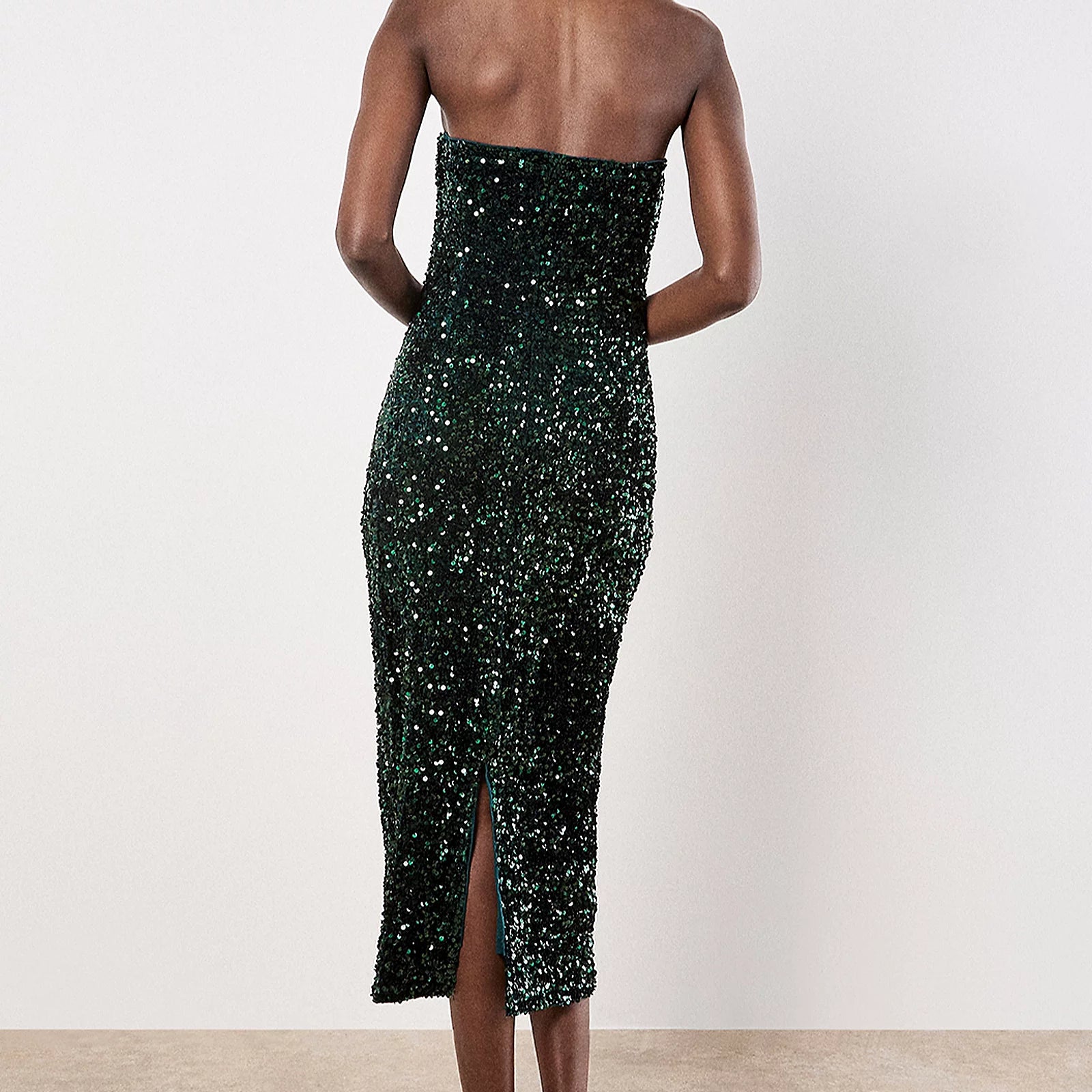 Meet the Apricot velvet sequin bandeau bodycon midi dress, a dazzling piece that fuses plush velvet with shimmering sequins for a glamorous finish. Whether youre celebrating a special occasion, heading out for cocktails or making an entrance at a festive party, this dress promises a show-stopping silhouette. Style it with strappy heels and a clutch for an effortlessly chic evening look.